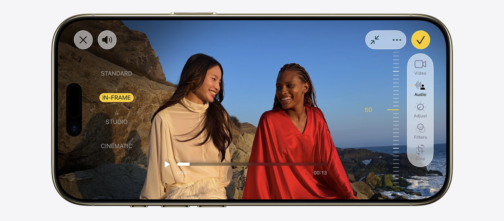Фронтальная камера прямиком из PRO. Теперь она имеет разрешение 18 МП и поддержку Center Stage. Сенсор стал квадратным. Больше не надо поворачивать смартфон, чтобы снимать вертикальные и горизонтальные фото и видео.